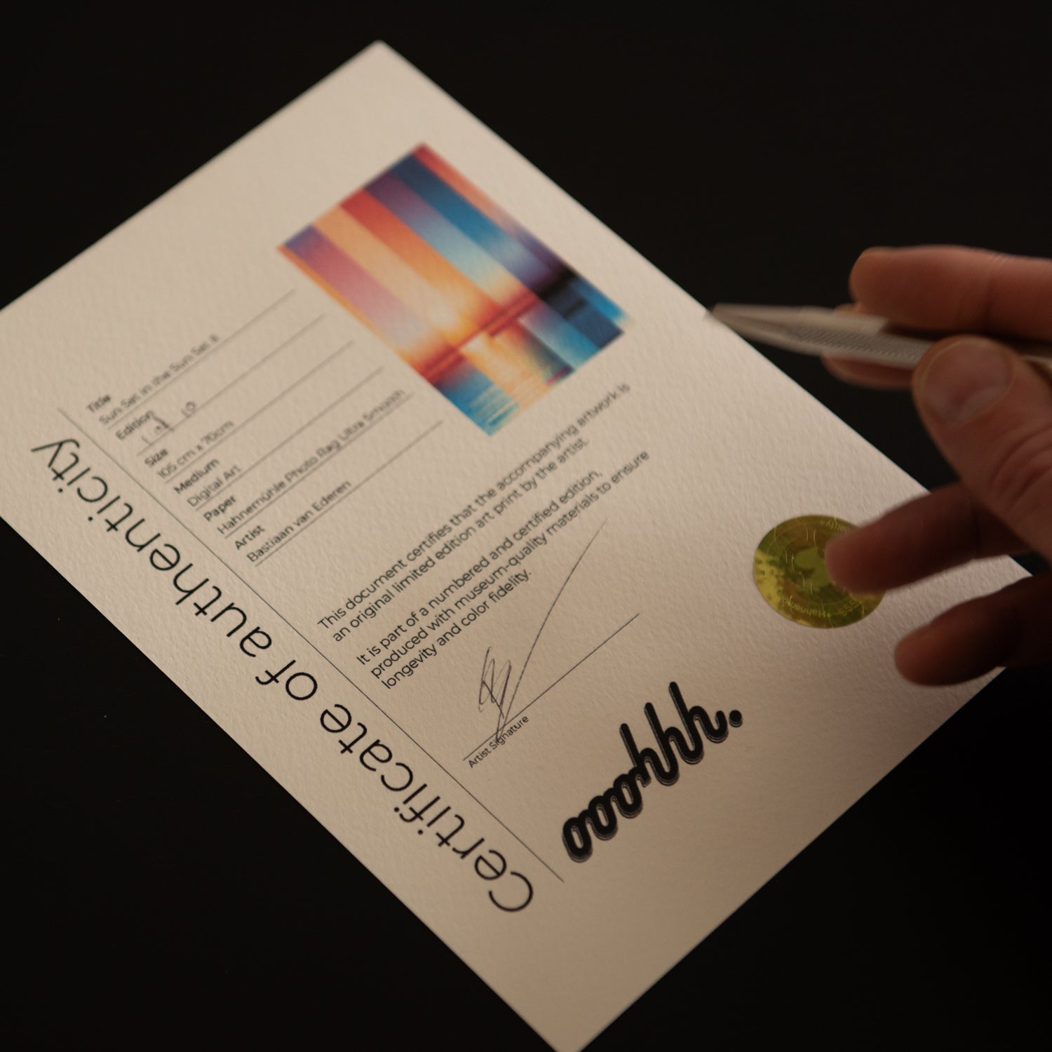 - Uniek registratienummer (Hahnemühle Art Licensing Registry via MyArtRegistry.com)