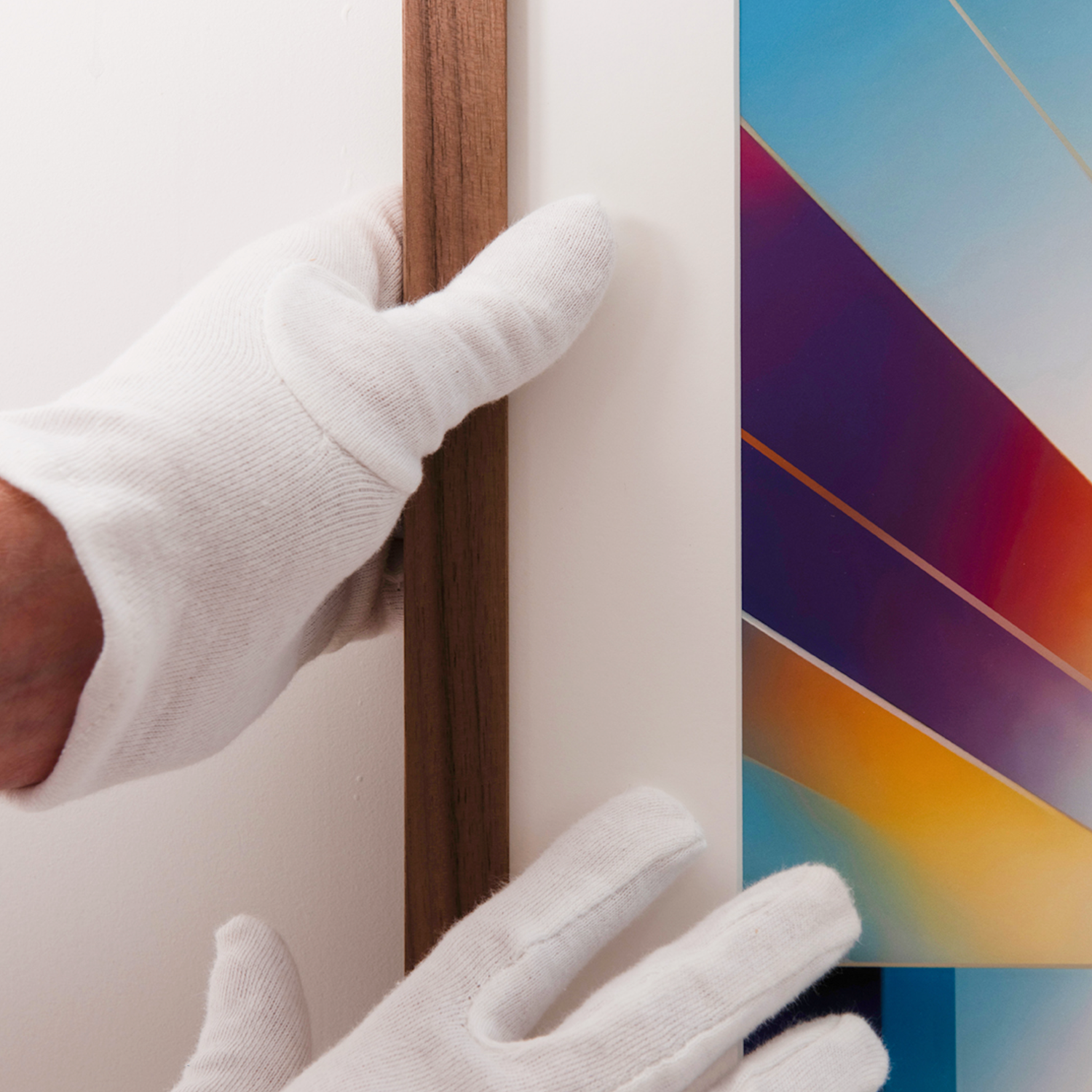 Hoogwaardig, ontspiegeld museumglas. Het ontspiegelende oppervlak voorkomt storende reflecties en zorgt voor een natuurgetrouwe kleurweergave. Het beschermt het kunstwerk bovendien tegen UV-straling. (Groglass Artglass AR)